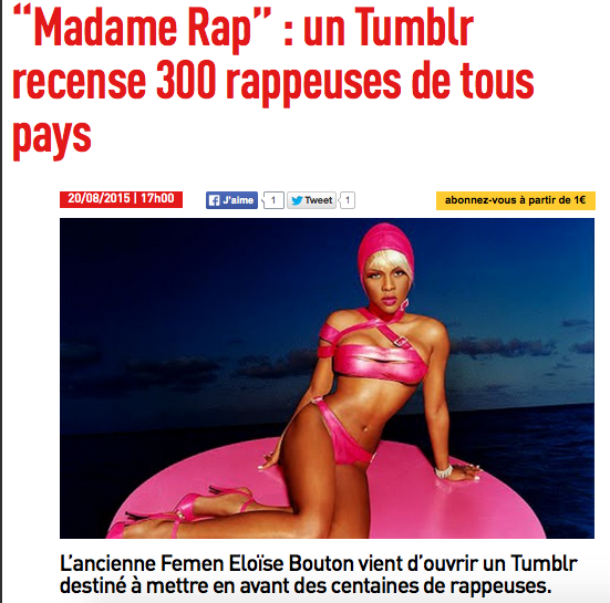 “Éloïse se considère aujourd’hui comme une “féministe free-lance” et profite de l’indépendance de son militantisme pour multiplier les initiatives à titre personnel. La dernière en date s’appelle Madame Rap. Un cool blog hébergé sur Tumblr qui recense aujourd’hui pas moins de 420 rappeuses originaires du monde entier.” Lire l’interview et l’article