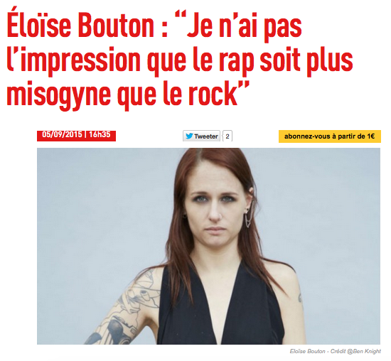 “Pour Éloïse Bouton, journaliste spécialiste de rap et militante féministe, « il est indéniable qu’il y a de la misogynie dans le rap, mais au même titre que dans le reste de la société ». Sauf qu’il attire plus de critiques car elle s’y voit davantage qu’ailleurs, « ses codes étant très crus, très frontaux et loin des normes des élites qui décident qui est fréquentable ou pas.” Lire l’article