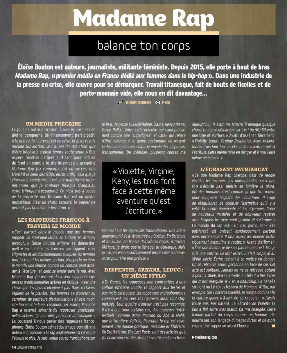 “Avec Madame Rap, le site qu’elle a lancé en août 2015, cette ex-Femen, journaliste et militante, offre une visibilité sans précédent aux rappeuses du monde entier. Désormais épaulée par la Dj et productrice Emeraldia Ayakashi, Eloïse Bouton allie sa passion du hip hop à son militantisme féministe au sein de ce projet qui prend de plus en plus d’ampleur…” Lire l’article sur Cheek