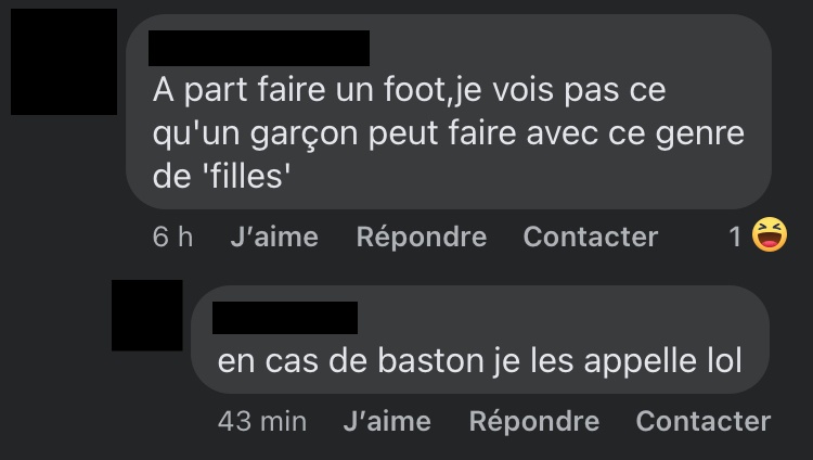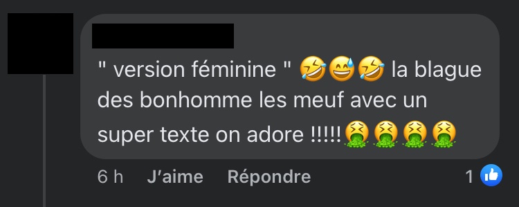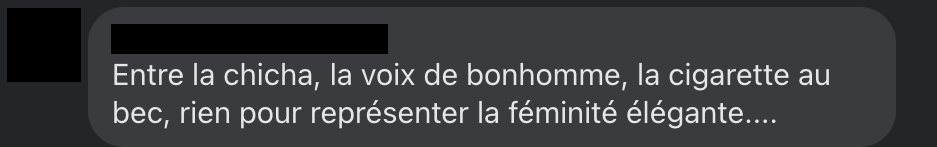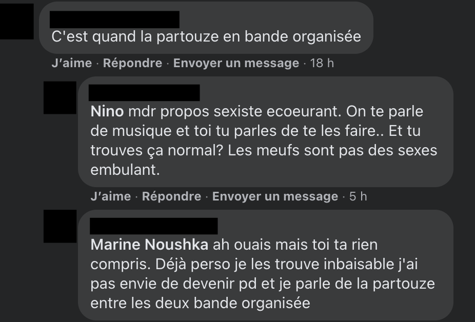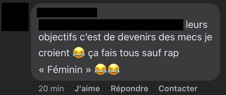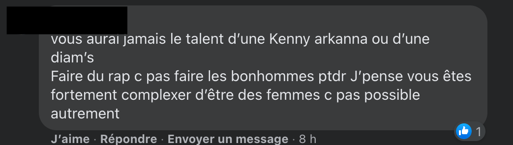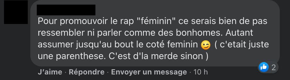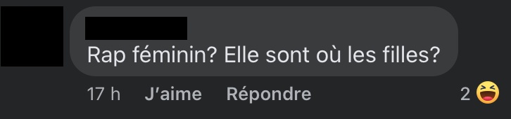 Madame Rap supprime certains commentaires haineux et bannit leurs auteurs. Petite précision d’ailleurs, les captures d’écran des commentaires sont anonymisées non pour protéger l’identité des auteurs, mais pour montrer qu’ils traduisent un fonctionnement systémique et non des abus d’individus isolés. Car c’est aussi ça le patriarcat.